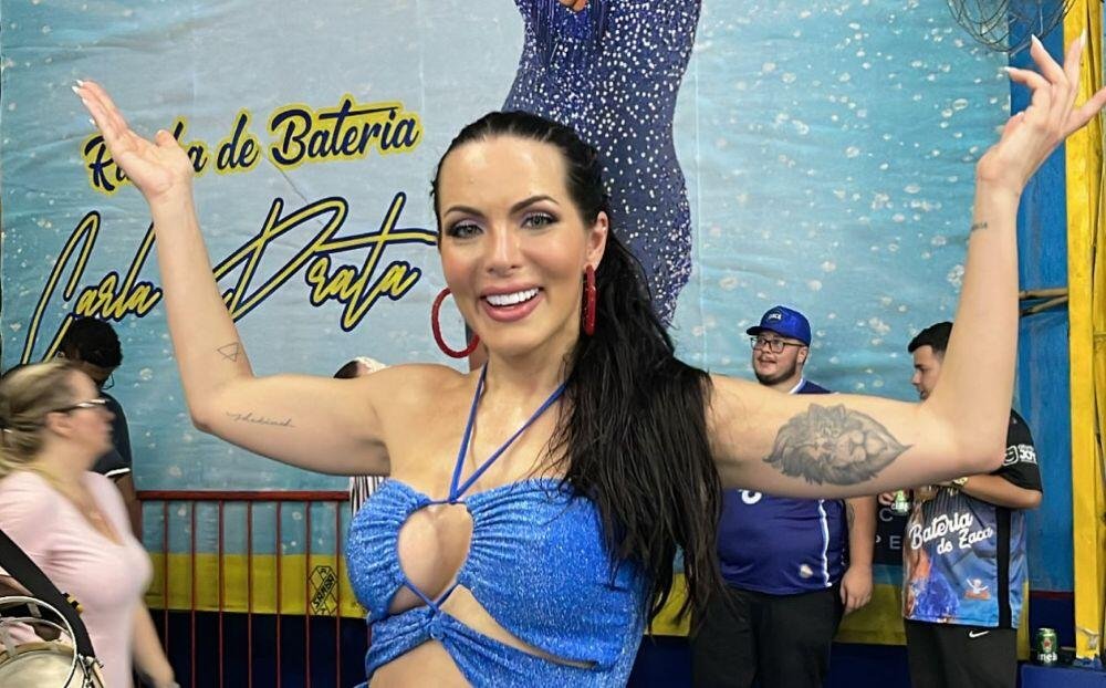 Demonstrando já estar no clima da folia de momo e com o samba na ponta do pé, a apresentadora da RedeTv que comanda aos domingos o programa ‘Selfie com Carla Prata’, escolheu para a ocasião um vestido azul na principal cor da agremiação, com vários recortes onde deixou a barriguinha trincada à mostra, assim como as pernas torneadas.