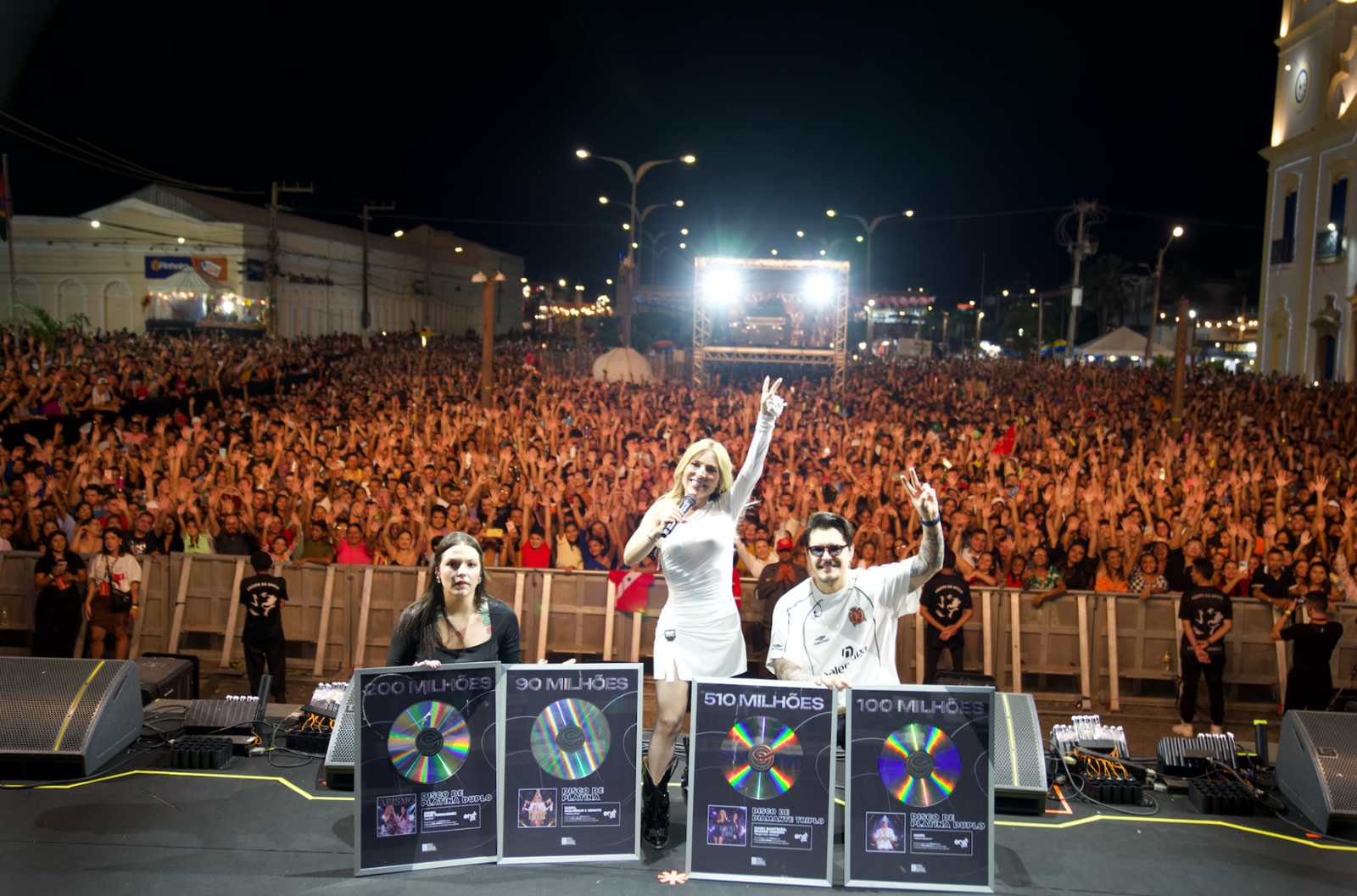 Neste sábado (29), Manu Bahtidão foi surpreendida por sua equipe durante o show em Aracati/CE. Fenômeno em todo o país, a cantora recebeu no palco, diante de milhares de pessoas, quatro certificados: um de Diamante Triplo, dois de Platina Duplo e um de Platina, reafirmando ainda mais seu sucesso que conquistou o Brasil.