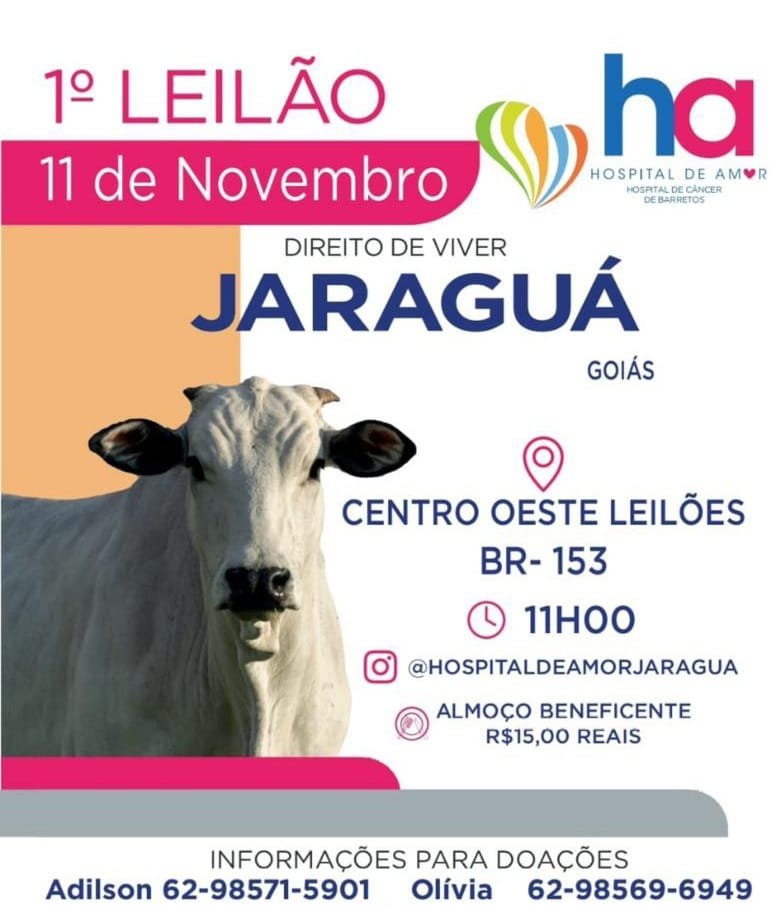 O primeiro leilão beneficente de Jaraguá, em prol do Hospital de Amor de Barretos, terá toda a renda revertida para o Hospital de Barretos.